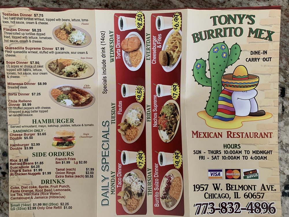 Tony's Burrito Mex is a Tex-Mex restaurant located at 1957 W Belmont Ave in Chicago. They offer a variety of dishes including tacos, breakfast items, and brunch options. The menu features vegan and vegetarian options, making it a great choice for those with dietary restrictions. Whether you're looking for a casual meal with friends or a family-friendly dining experience, Tony's has something for everyone. With amenities like delivery, takeout, reservations, and waiter service, they strive to provide a seamless dining experience. The restaurant also offers outdoor seating, catering services, and a full bar for those looking to enjoy a drink with their meal. Overall, Tony's Burrito Mex is a versatile dining option that caters to a diverse range of tastes and preferences.